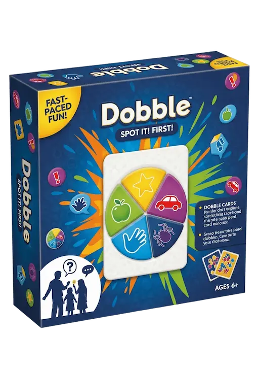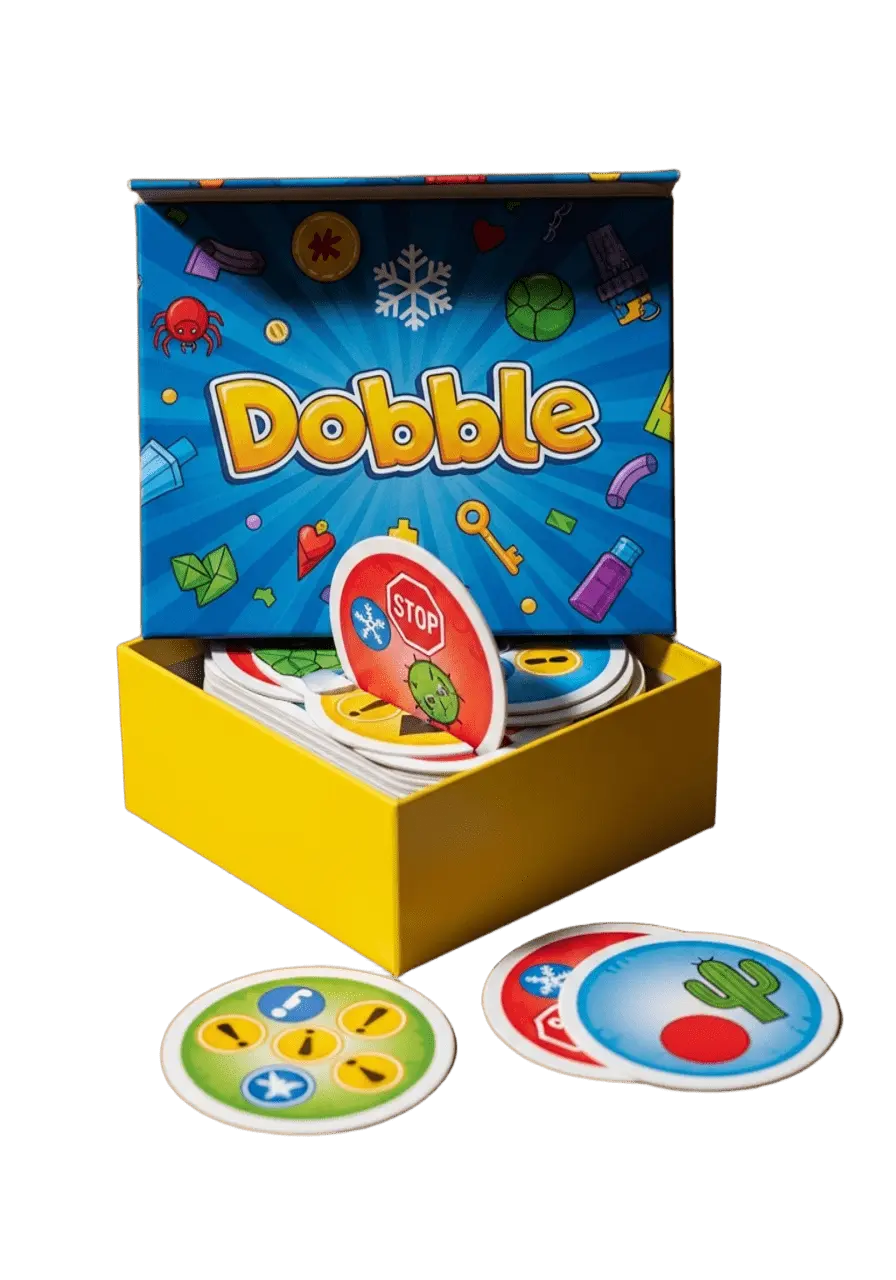 Dobble to szybka gra karciana oparta na percepcji wzrokowej. Każda para kart ma dokładnie jeden identyczny symbol. Gracze muszą go znaleźć szybciej niż inni. Szybkość jest ważniejsza niż strategia.