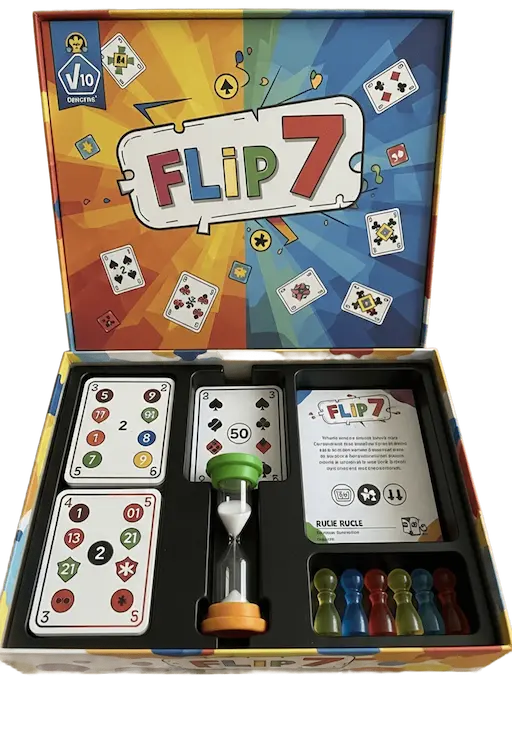 Flip 7 to szybka gra karciana typu „push-your-luck”, oparta na ryzyku i wyczuciu czasu. Gracze muszą zdecydować, kiedy przestać odwracać karty, aby uniknąć przegranej. Zasady są proste, ale decyzje są pełne napięcia. Flip 7 zapewnia szybką, ekscytującą rozgrywkę o wysokiej wartości powtórkowej.
