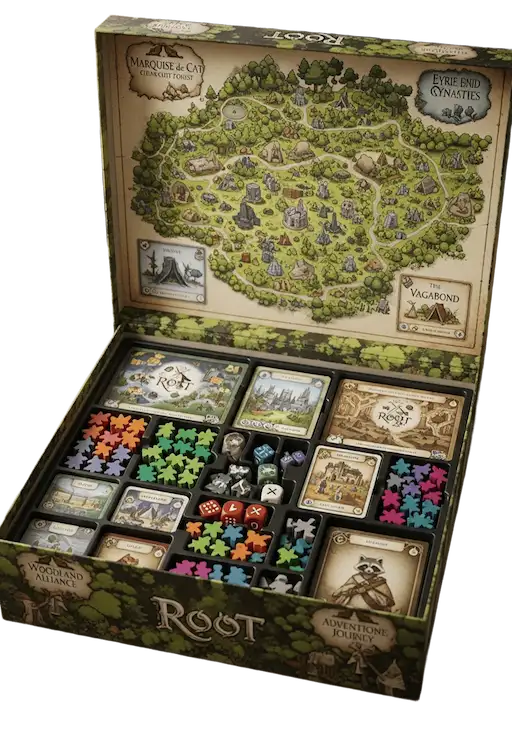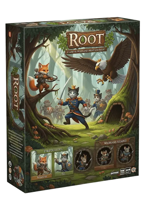 Root to asymetryczna gra strategiczna, w której każda frakcja gra inaczej. Gracze zdobywają punkty poprzez silniki, rzemiosło i obecność na planszy. Konflikty i polityka kształtują środkową i końcową fazę gry. Root nagradza opanowanie frakcji i sprytne wyczucie czasu. Oferuje ogromną wartość powtórkową z odpowiednią grupą.