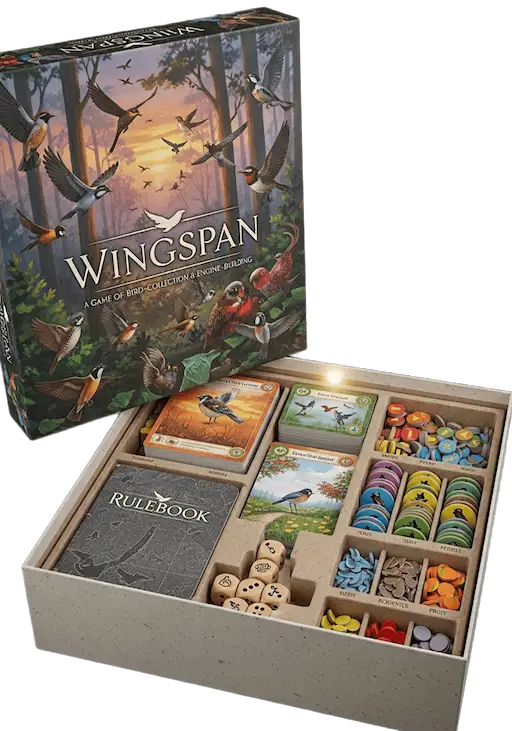 Wingspan to gra planszowa dla 1–5 graczy, polegająca na budowaniu silnika. Gra skupia się na ptakach, siedliskach i zarządzaniu zasobami. Gracze przyciągają ptaki, aby zbudować wydajne silniki kart. Zasady są jasne, ale gra charakteryzuje się dużą głębią strategiczną.